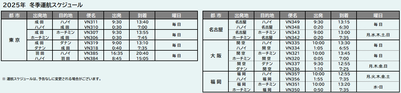 ◆片道・往復ともにベトナム国籍用に特別運賃をご用意しております◆ 片道:20,000円~ 往復:31,000円~ ※正規割引運賃 ※ベトナム国籍運賃ご希望の場合はお問合せ下さい。 日本からは成田・関西・中部・福岡からそれぞれハノイ線・ホーチミン線し羽田空港からは日本各地から国内線の乗継が可能なスケジュールでハノイ線を運航。成田などからは中部のリゾート地ダナンへの直行便を運航しております。 ベトナム国内路線はもちろん、タイ(バンコク)・シンガポールなどの東南アジアや豪州、ヨーロッパへの乗り継ぎも便利となっております。